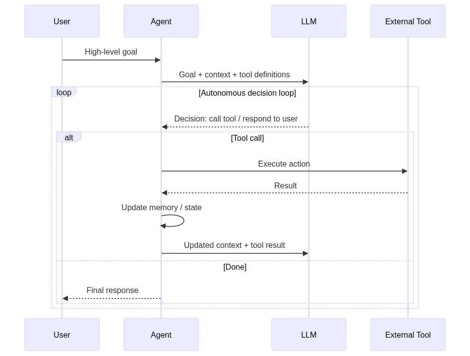 From a conceptual perspective, an AI agent autonomously takes actions based on a high-level goal and remembers what it did across sessions. From a technical perspective, it's a while-loop with an LLM, some tools, and a growing context window.